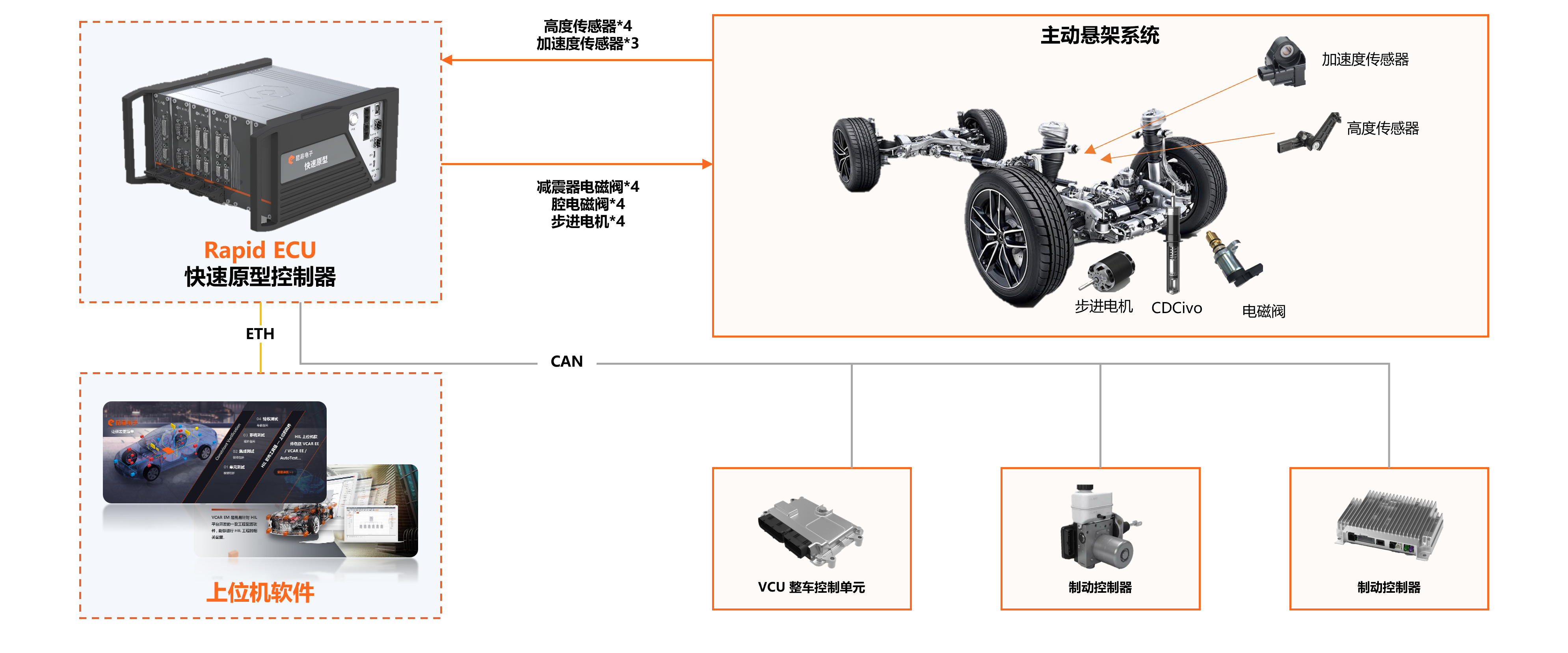 Rapid ECU提供丰富的IO接口和完备的底层驱动,支持用户基于MATLAB/Simulink开发应用层模型,一键生成适配快速原型控制器的模型文件;配套软件可实现模型导入、应用配置与控制器下载,无需额外工具即可完成测量与标定工作