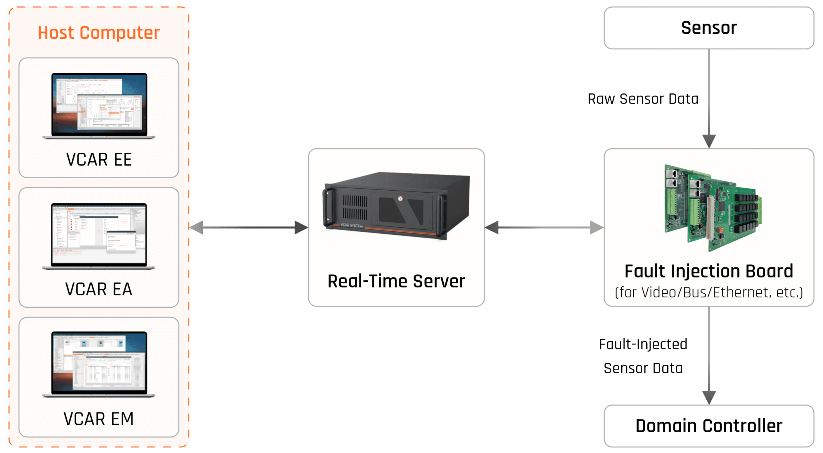 To verify the functional safety of control systems, VCARSYSTEM has launched on-road and bench fault injection solutions. These establish a validation infrastructure for controller error recovery mechanisms, supporting diverse fault injection tests and predefined response strategies. The solution utilizes automated testing systems to significantly reduce testing costs, enhance test coverage, and provide robust assurance for the functional safety of control systems.